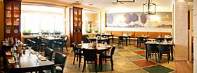 Заведение очень удачно зонировано – есть основной зал и зал рядом с детской комнатой, застекленная веранда, а с весны до ранней осени работает и летняя терраса. Интерьер разработала известный декоратор Ольга Кудрявцева. Стены украшают масштабные репродукции итальянского художника Бернардино Фунгаи, а пол - разноцветная клетка, напоминающая пестрый костюм Труффальдино.